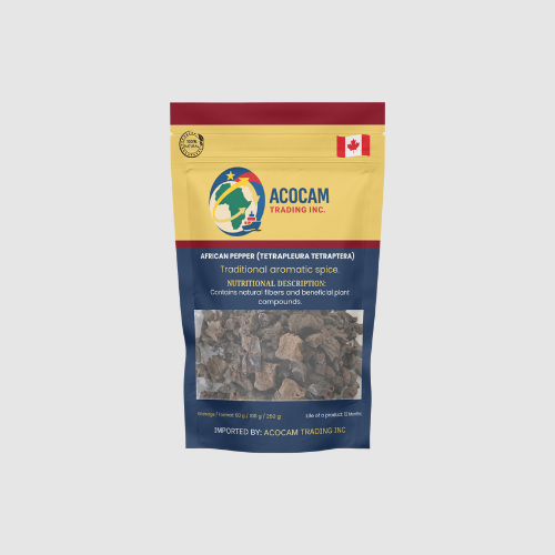 African Pepper (Tetrapleura tetraptera) is a traditional and highly valued spice in African cuisine, famous for its warm aroma and distinctive taste. It is widely used to season soups, stews, sauces, meat, and fish, giving dishes a deep, smoky, and aromatic flavor.